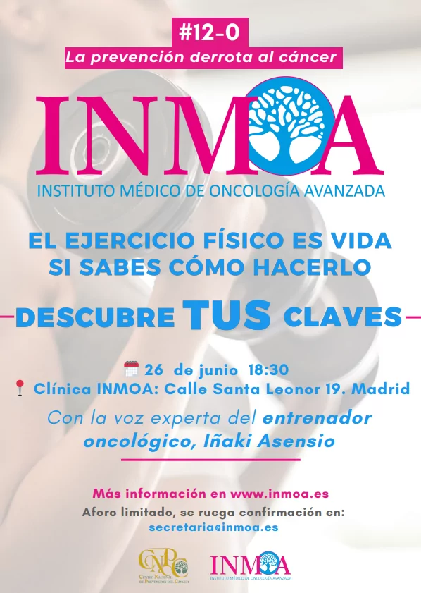 El 26 de junio a las 18:30, la Clínica INMOA en Madrid te invita a una charla imprescindible sobre la importancia del ejercicio físico en la prevención y tratamiento del cáncer.